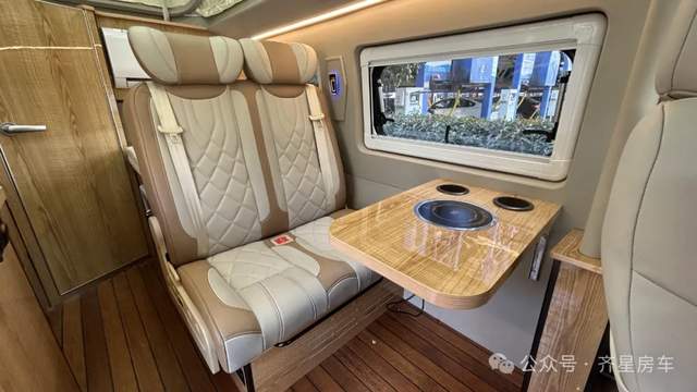 齐星经典前3后2布局,整车荷载5人,会客区是双人联排座椅设计,前方驾驶区座椅也可以进行前后的互换折叠,与后方形成对卡形式,中间的小桌板悬空折叠设计,可以通过座椅靠背放倒形成一张850*1995mm单人床,整车内饰墙体环保超纤皮包覆、呈现温馨明快的居家感。