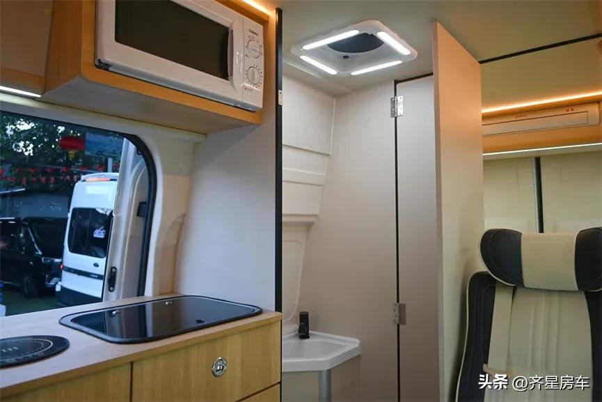 采用一体对称式的起居,主副驾驶室座椅旋转可与后方形成一个完整的会客区域,旁边的吧台区域集成了不锈钢洗菜池与800W电磁炉,顶部还嵌入了微波炉,吧台下方嵌入48L房车冰箱,侧面小桌板可以延长,形成了一条动线的简餐吧台,紧邻吧台中部是固定洗漱间,会客起居空间贯通,整体通透整洁。