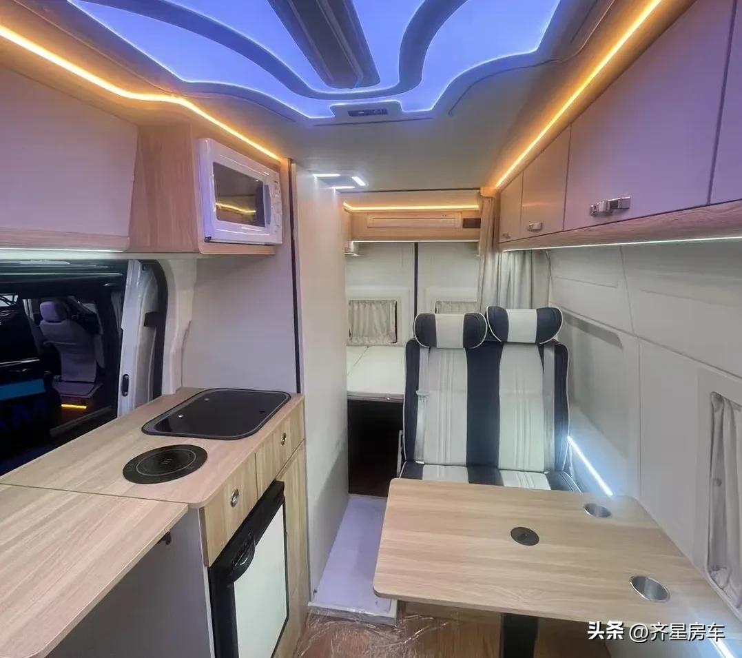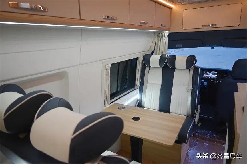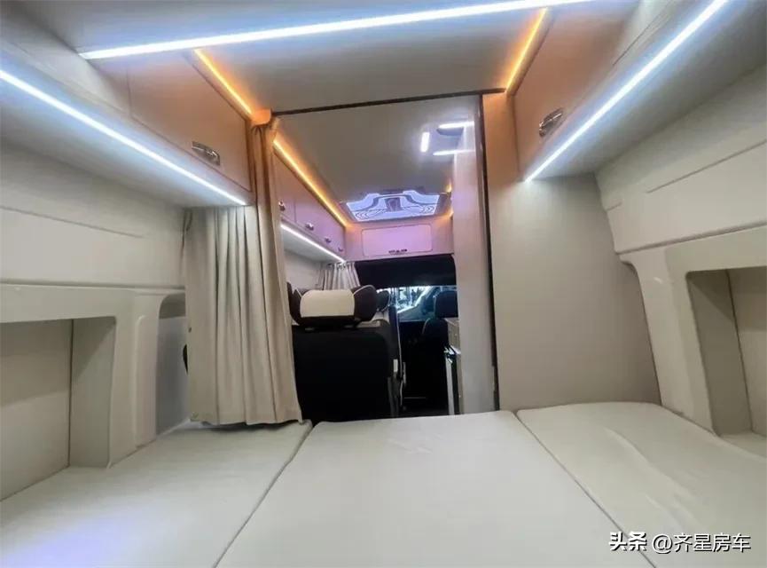 齐星经典的后横床布局,尾部超大的横床区域是主卧区、整车荷载6人,会客区是双人对卡座的设计,中间的升级小桌板可以根据需要,进行升降后拼成一张临时的单人床,整车顶部贯穿这储物吊柜搭配暖光氛围灯以及顶部LED造型灯、内饰墙体环保超纤皮包覆、呈现温馨舒适的居家感。