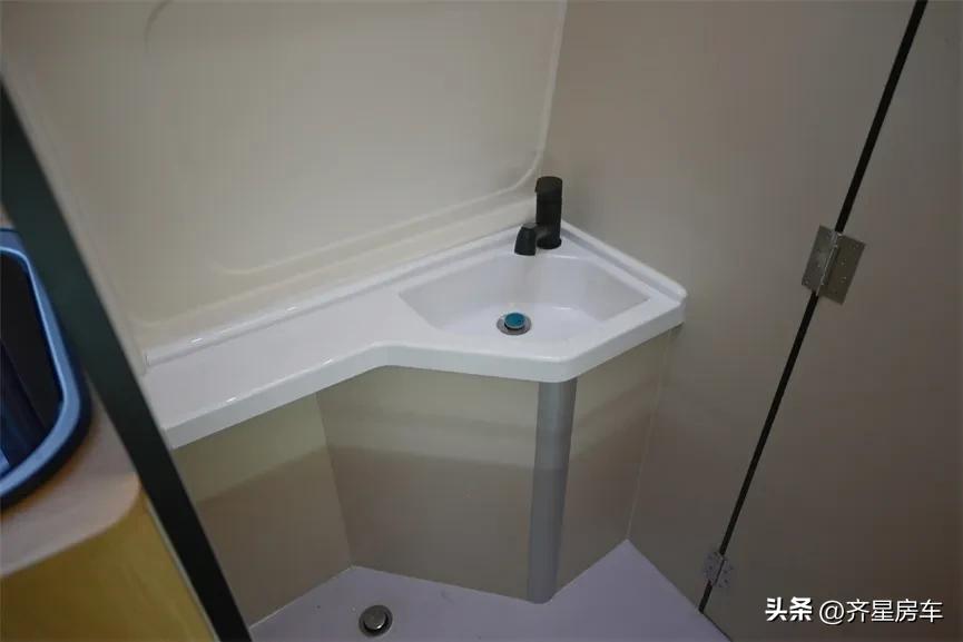 卫生间是便携式的马桶,可满足行车应急和日常储物使用,独立的抽拉式花洒龙头洗手池,配有顶部双向换气扇。