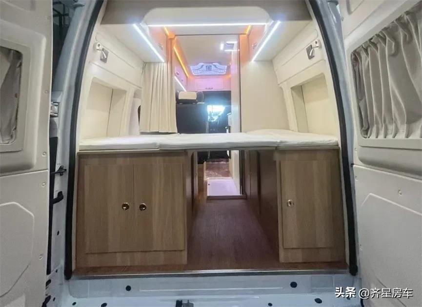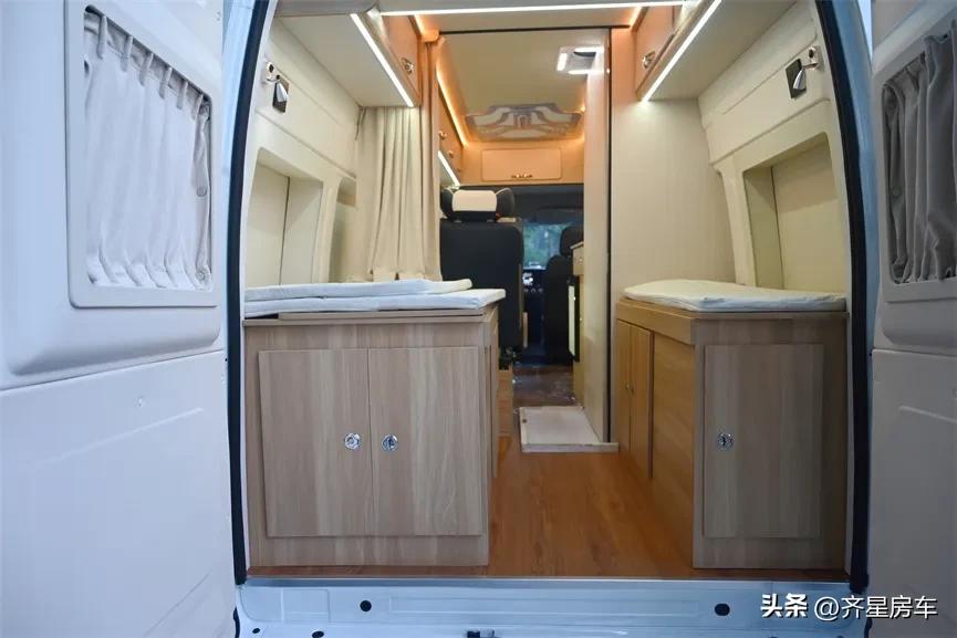 后横置床尺寸为1200*1850mm,由于后方尾门采用180度平开,为方便床铺的储物与拿取,床铺是采用三折拼接形式的,床铺的四周同样可以储物,左右两扇盲窗进行了拓宽与尾部两扇换气窗,顶部为房车的空调出风口,床头位置分配配了插孔与床头阅读灯以及尾部隔断帘,让入睡空间更显私密。