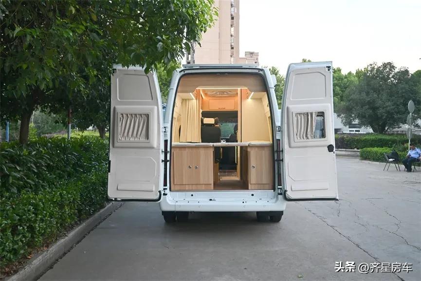 江铃福顺是一款主打自由亲民大空间的B型房车、齐星房车将商用旅居实用布局运用到该车型,打造了一款双人对卡座布局,后横床的大空间的齐星星领福顺FS2724房车。